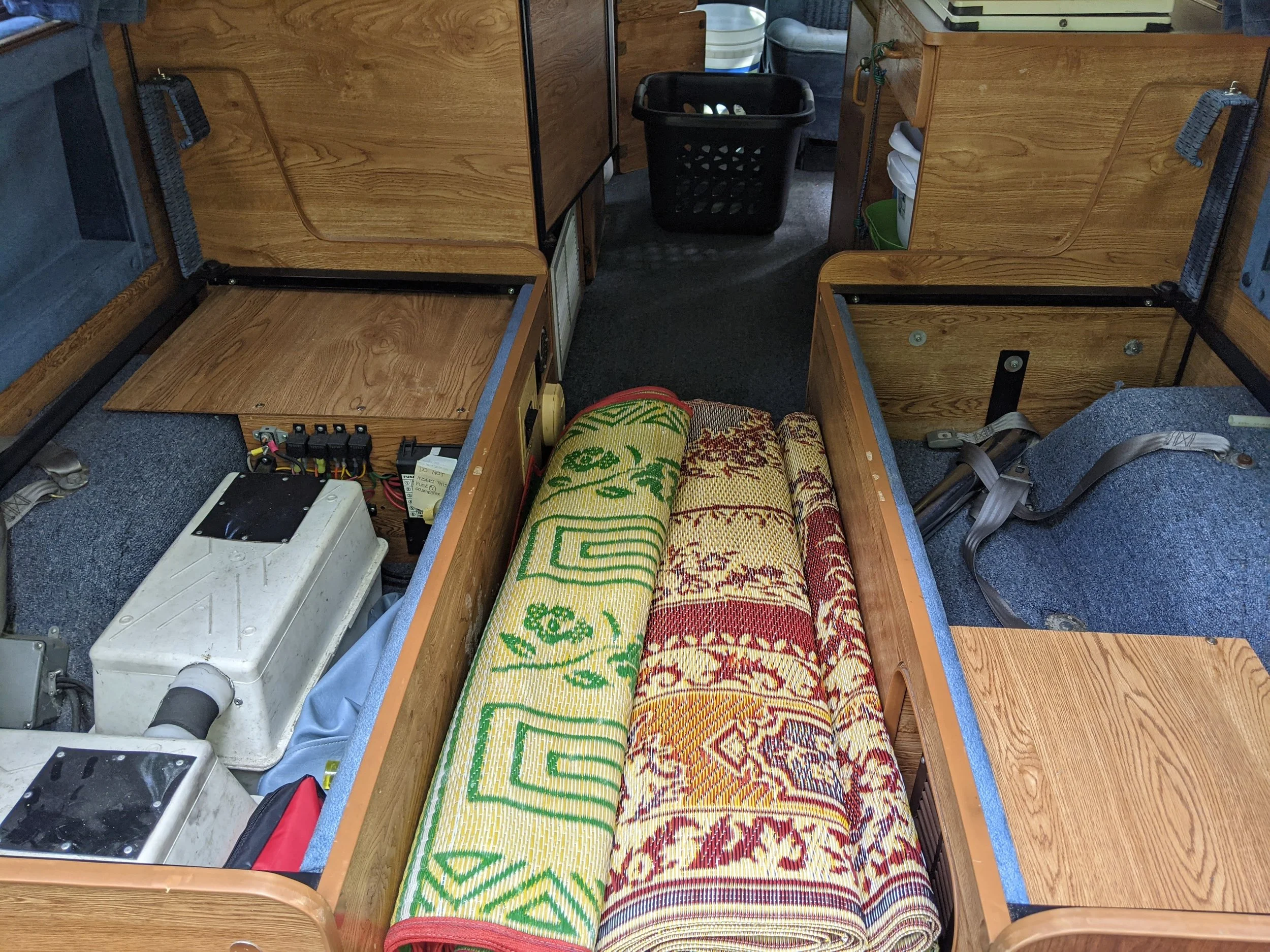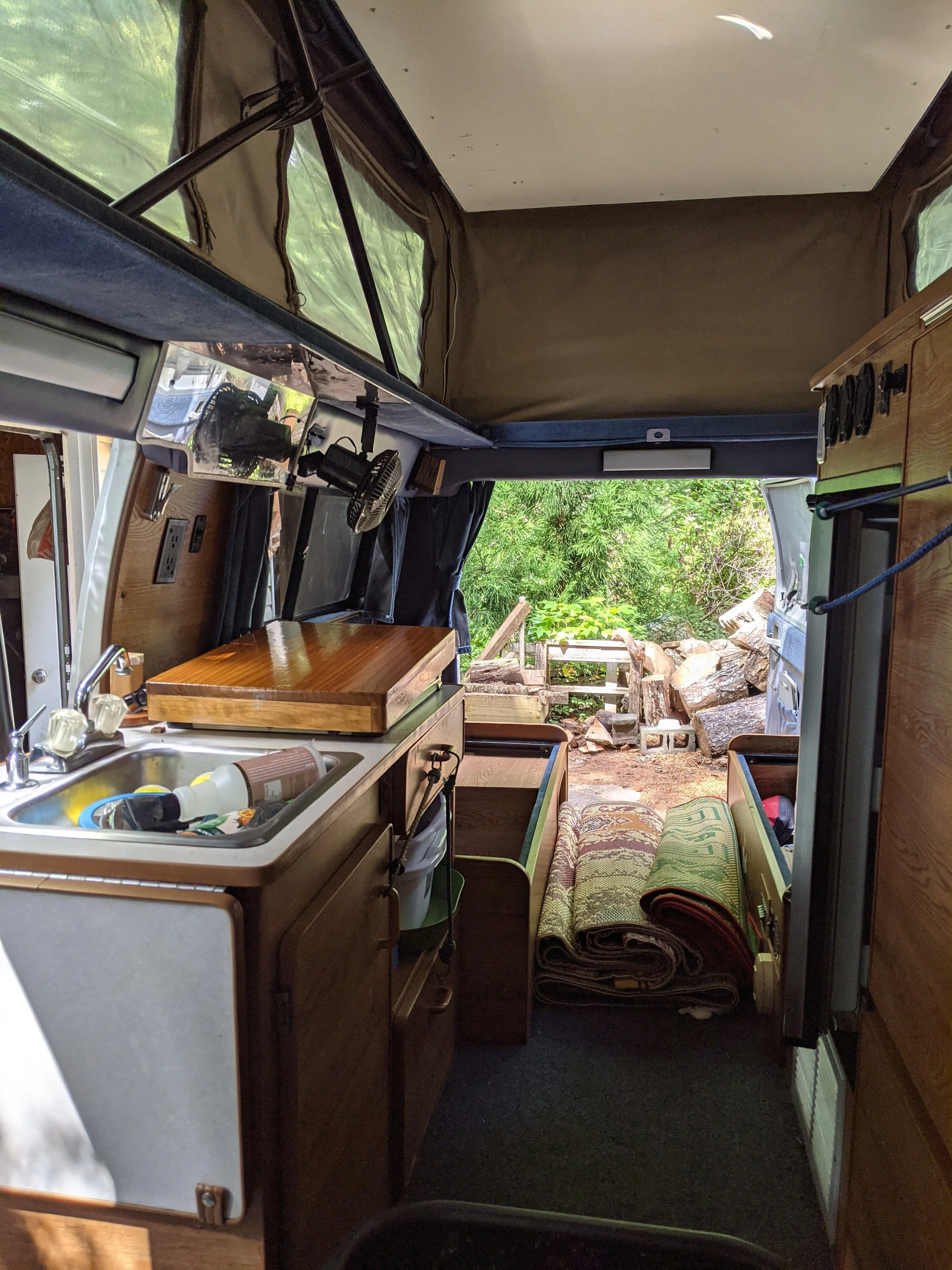 On the passenger side of the van, the sink and cooktop were removed, and the countertop was replaced. The pop-up countertop was also replaced.
